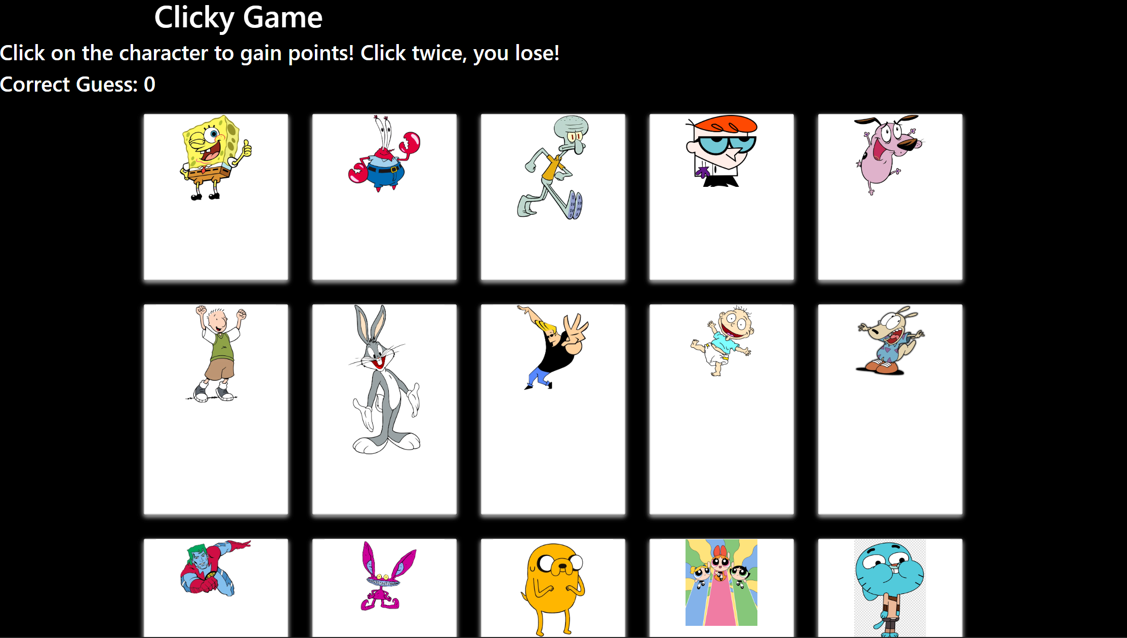 This is a react based web application that allows you to guess a character. Once you select the character, the position of all the characters with randomly change position. The goal of the game is to get all 15 characters guessed without selecting the same character!